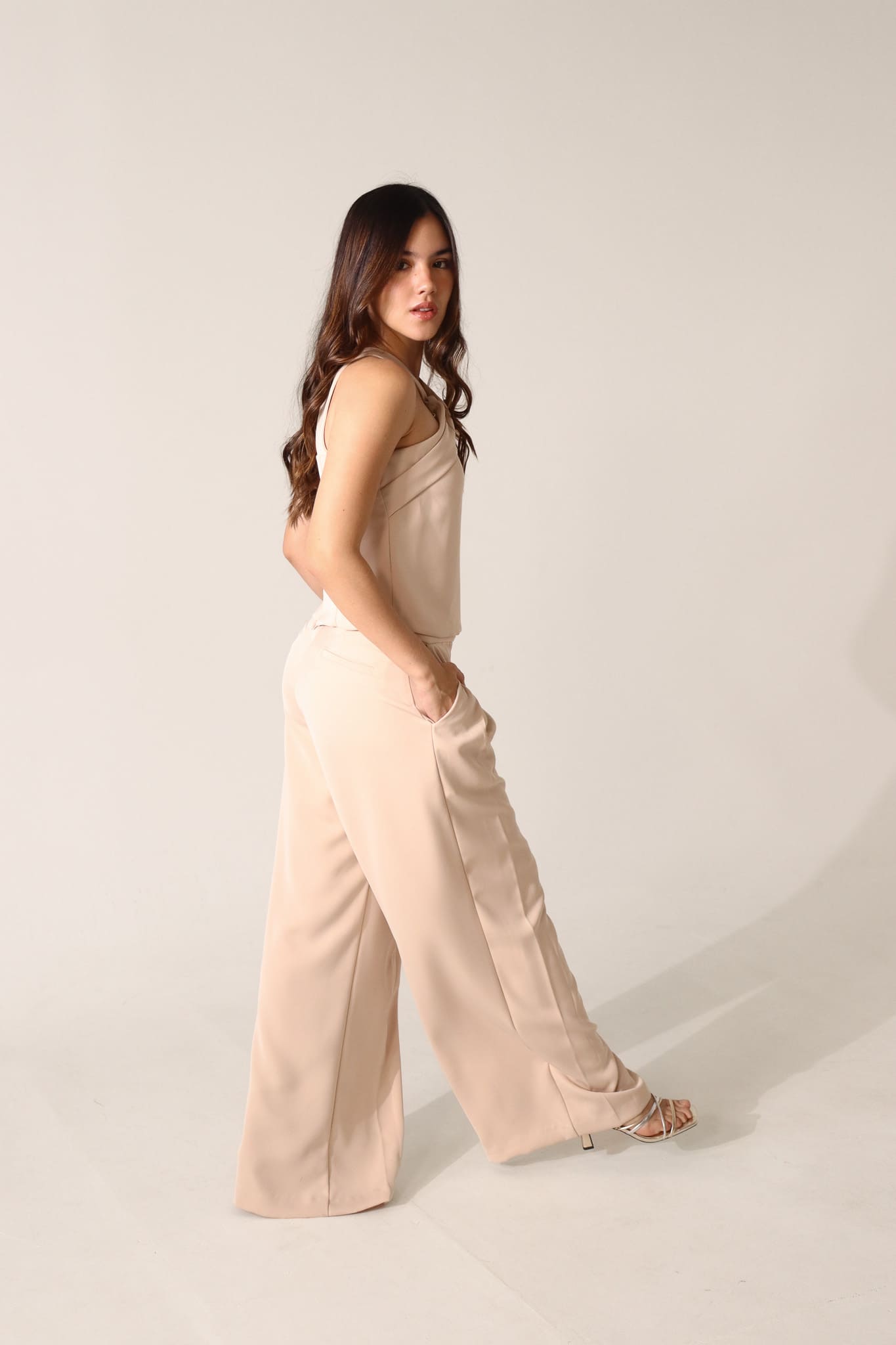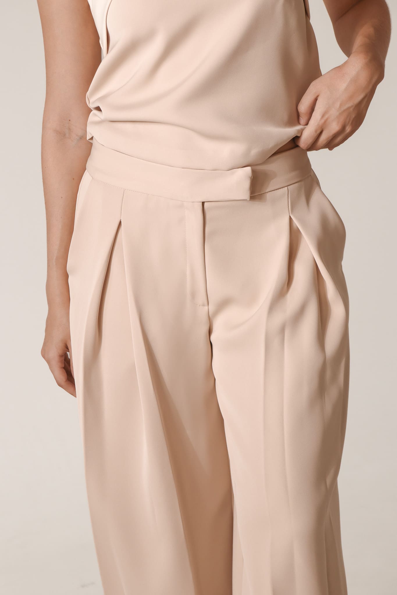 High-waist wide-leg pants with pleated front and side pockets, designed for movement and modern sophistication.