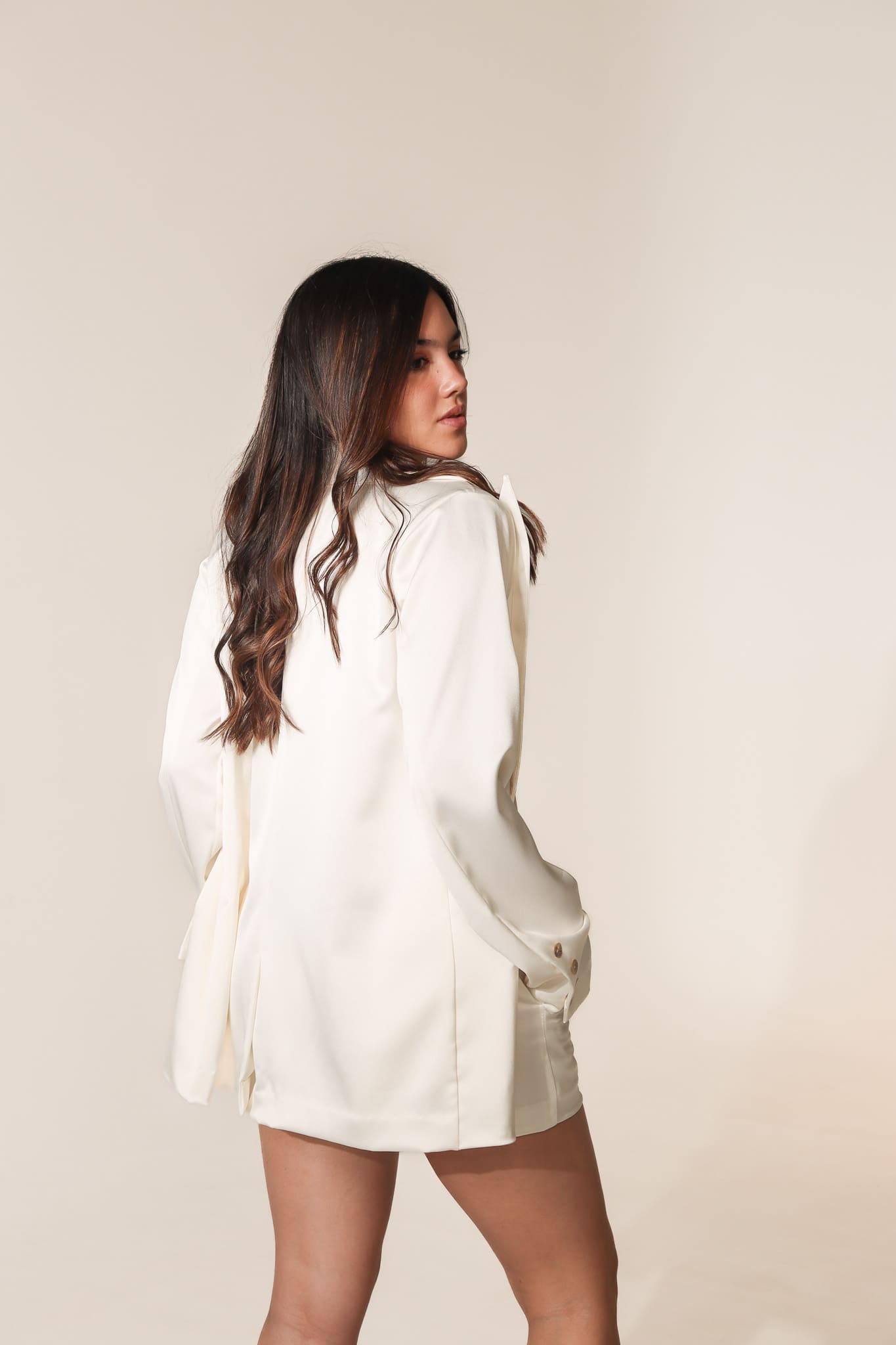 Satin blazer with pearl button accents paired with matching mid-rise mini shorts. An elevated take on modern tailoring with a touch of playful ease.