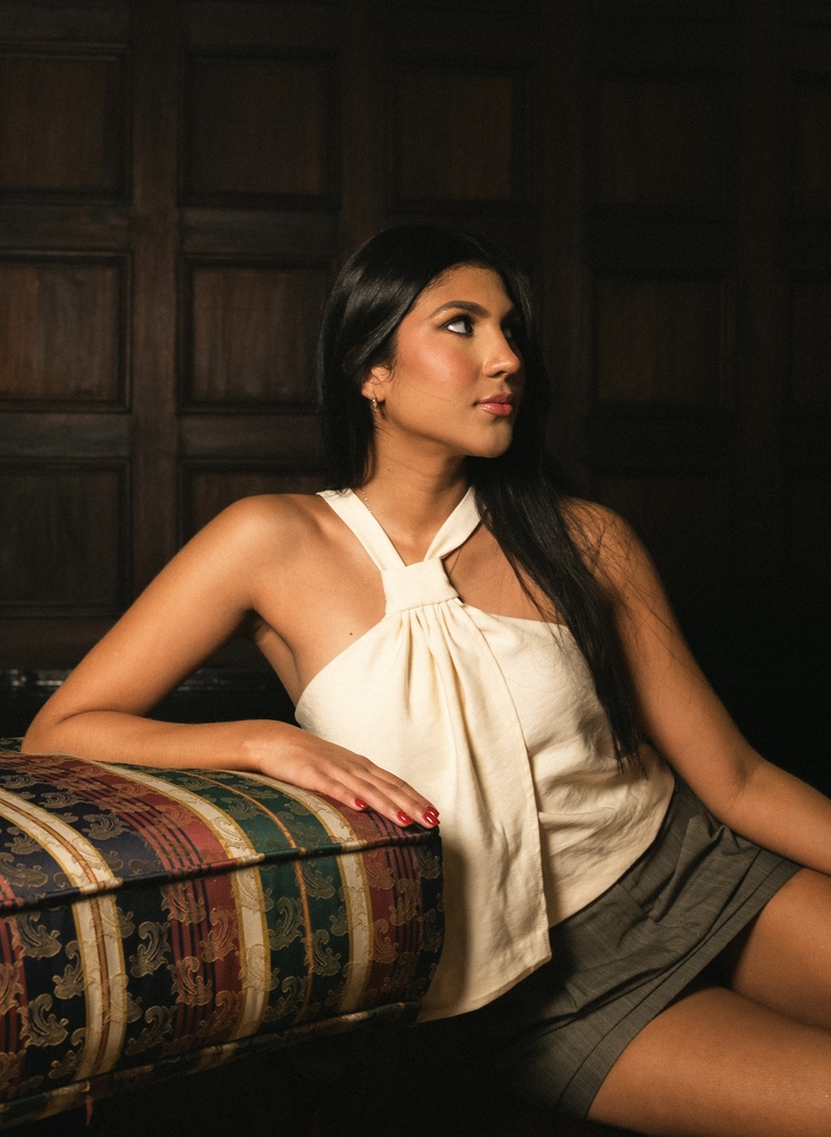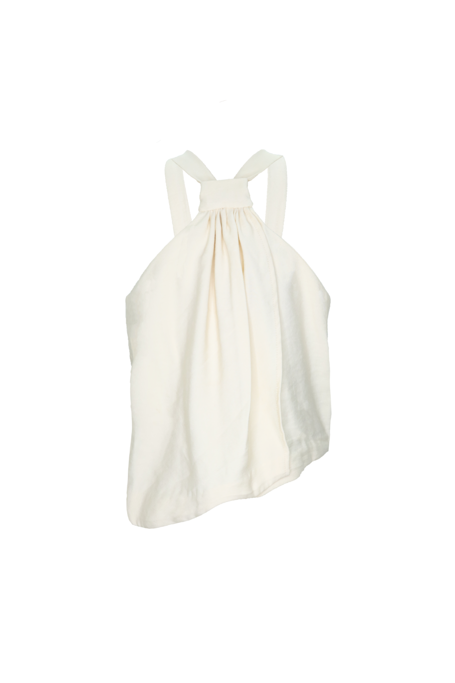 Halter asymmetric knotted top, with an overlay for added movement and made from lightweight fabric.