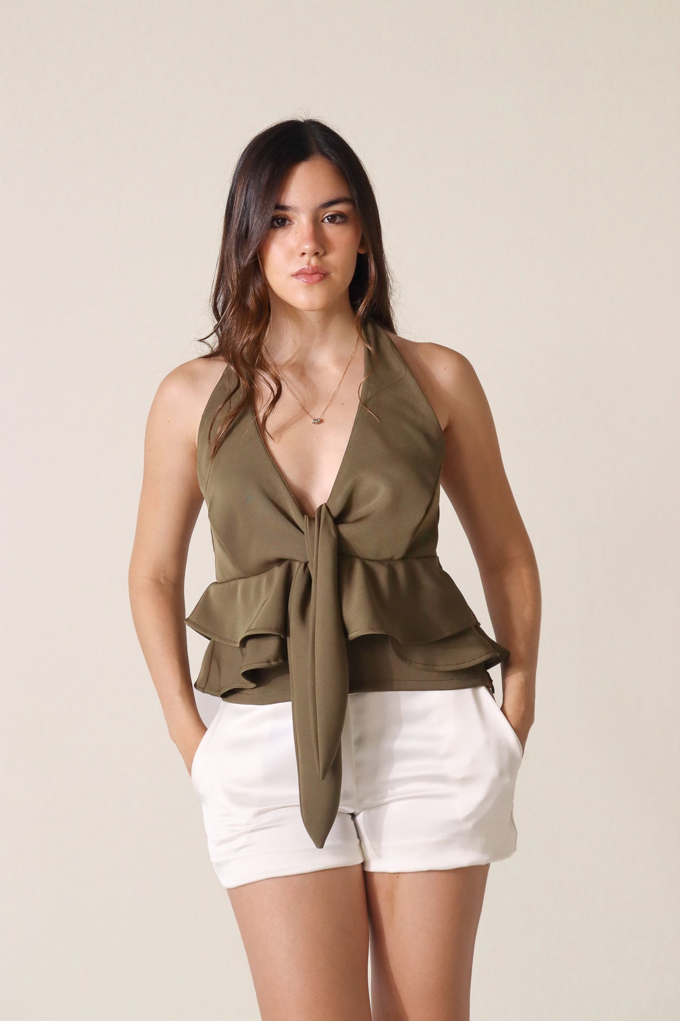 Halter tie-front top with layered peplum ruffles and a deep neckline, designed to bring playful elegance and a flattering fit.