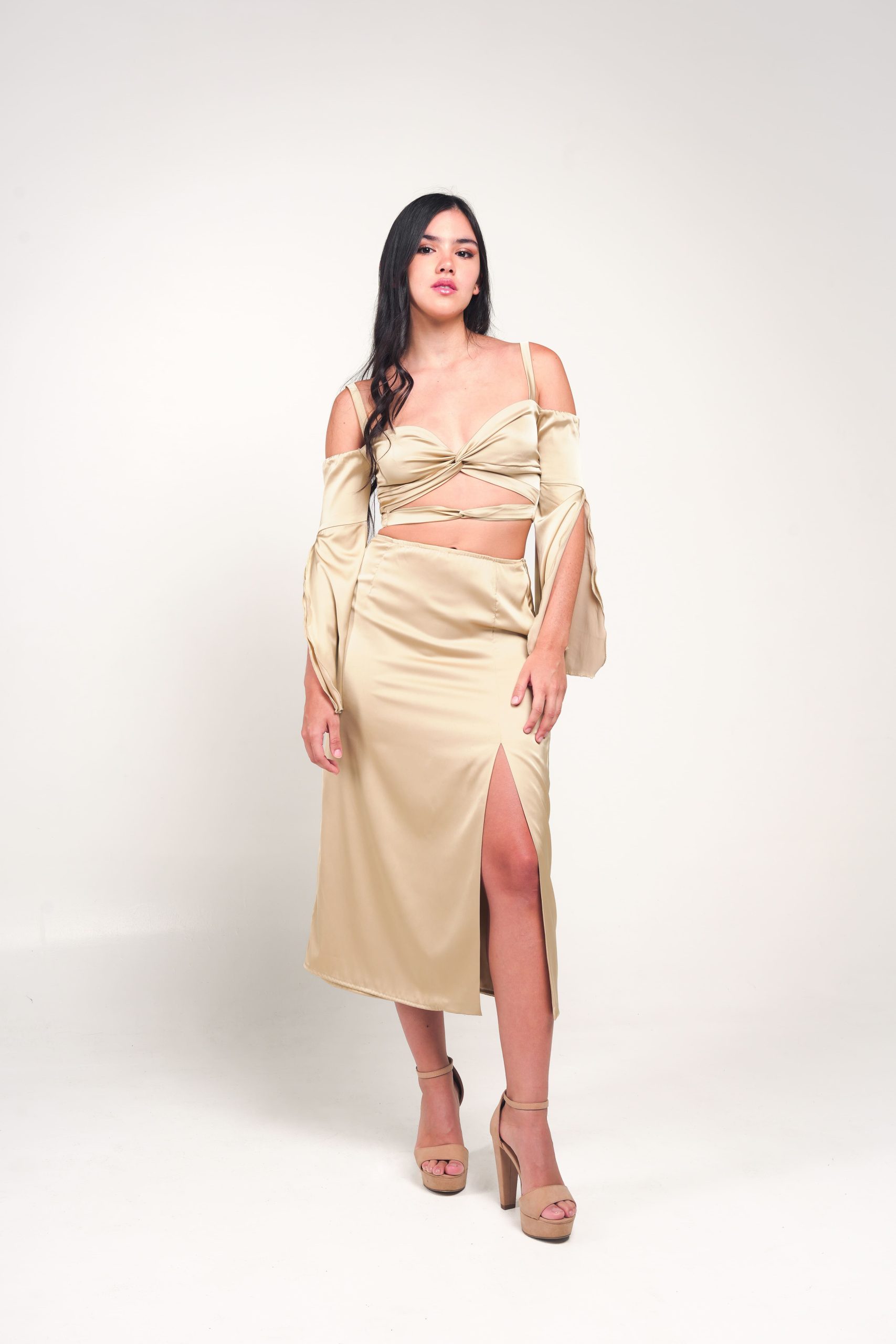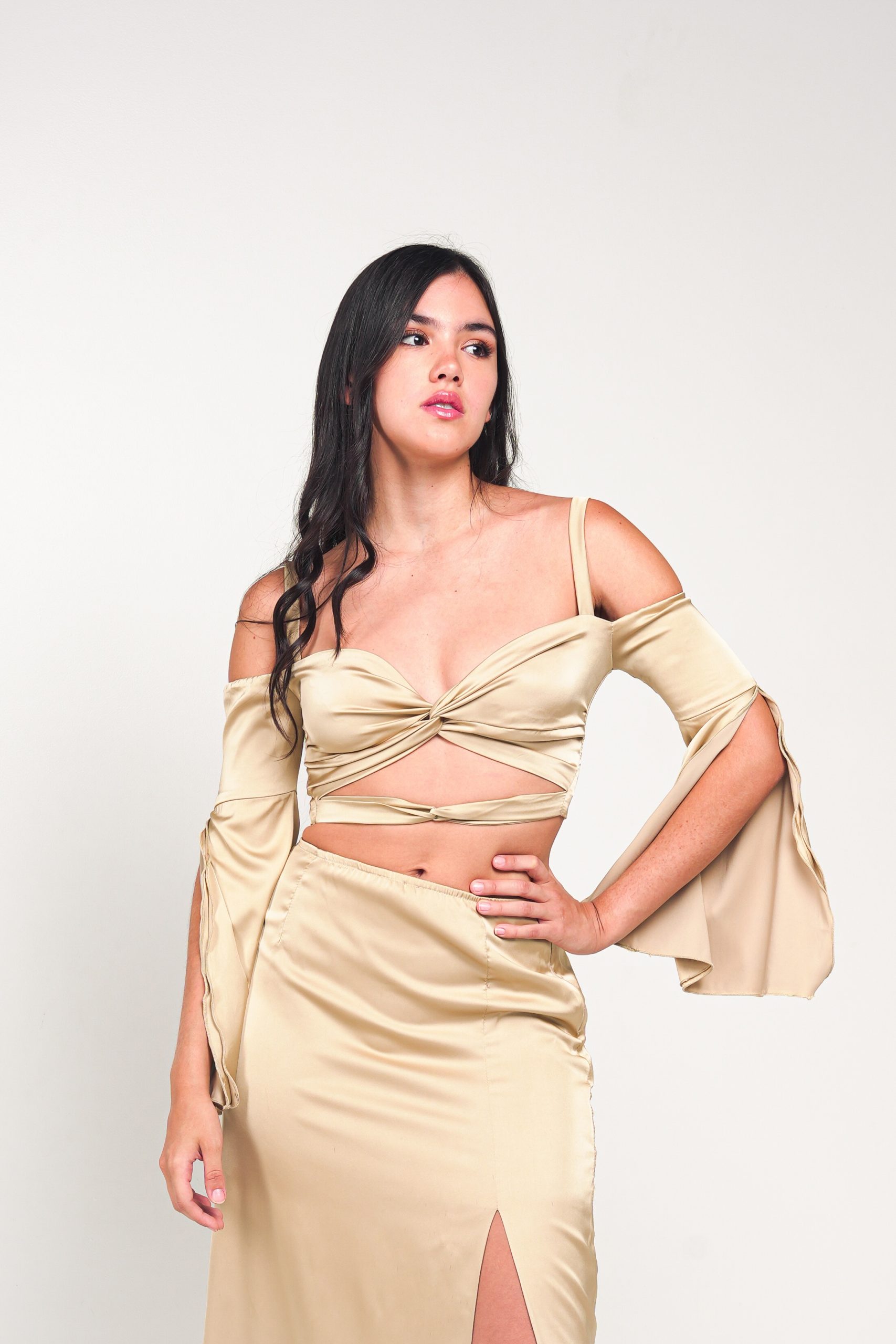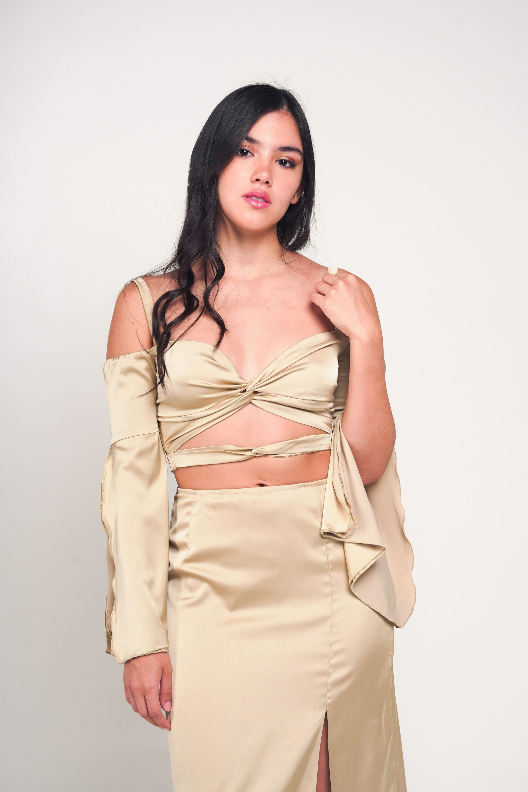 Twisted top with long and open sleeves.